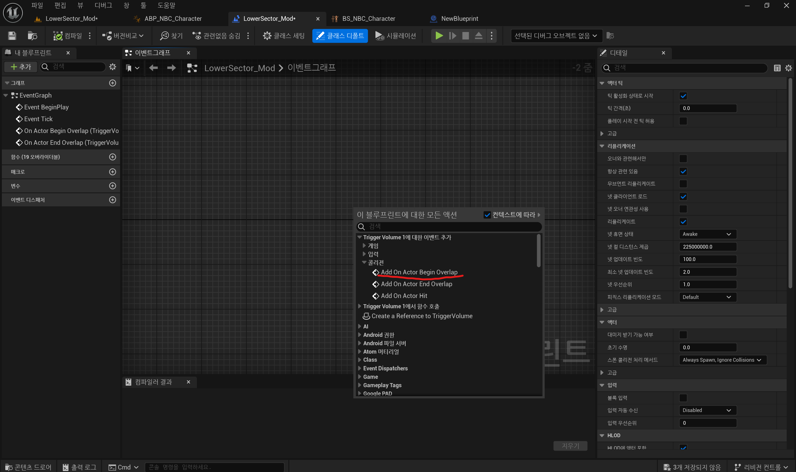 블루프린트에서 우클릭 후 Trigger Volume에 대한 이벤트 추가 > 콜리전 > Add On Actor Begin Overlap 을 선택해주고