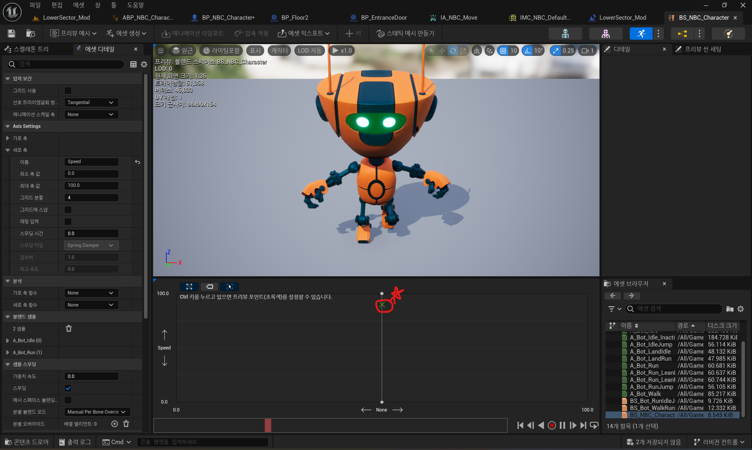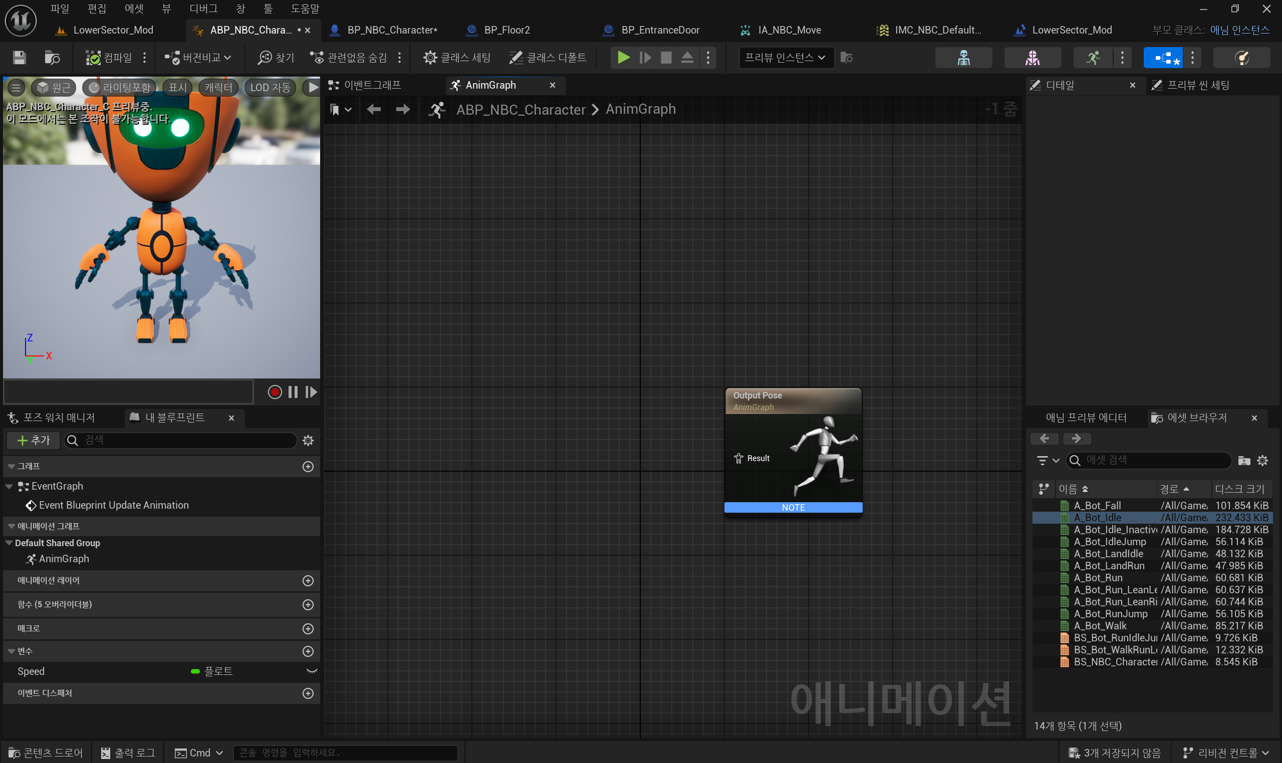 생성한 캐릭터의 AnimGraph에서 A_Bot_Idle 파일을 이용해서 아무것도 하지 않을때의 애니메이션을 적용시킨다.