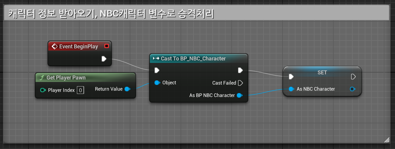 캐릭터를 변수로 승격시키고 다음과 같은 노드를 이용했는데 저기서 Cast To BP_NBC_Character 노드는 입력핀 (Get Player Pawn)이 Character인지 확인한 후 해당 타입으로 변환해줍니다.